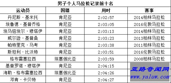一、男子马拉松世界纪录:丹尼斯·基米托2小时2分57秒