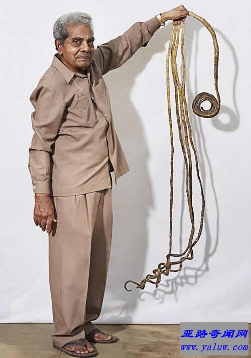 世界上最长的指甲,我们都知道,指甲长了容易滋生细菌,所以隔一段时间就要剪指甲,可是印度有一位奇人,指甲留了62年,从未剪过指甲,先如今一个手的指甲总长达查过9米,堪称是世界上指甲最长的人,拇指指甲更是长达2米,比我们大多数人都高。