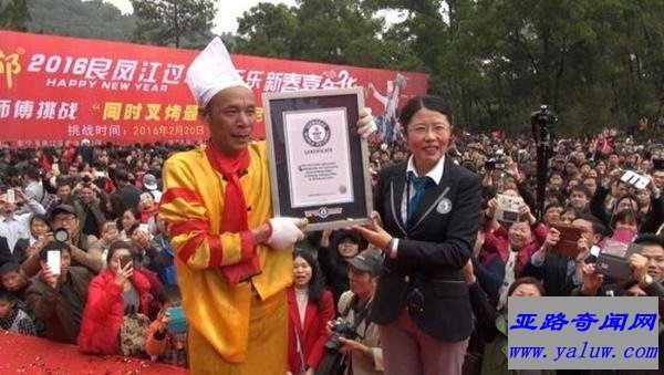 2月20日,中国农历正月十三,广西“烧烤狂人”阿炳(原名蒋林生)在南宁独自完成216只羊的烤制工作,挑战吉尼斯世界纪录成功。2007年10月,阿炳用100分钟现场烤制了2008只鸡,并申报了这一项目的吉尼斯世界纪录。此外,阿炳还创造了同时烤制100只乳猪,136头山羊的纪录。2016年正月初三,阿炳在南宁现烤2016只三黄鸡迎新春。张广权 摄