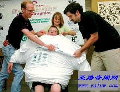 当奥斯汀往身上套上100件T恤衫时,他已经臃肿得根本无法再靠自己走路了;当奥斯汀穿上第150件T恤衫时,他的身体宽得已经根本穿不过门框。奥斯汀身上的T恤衫也一件比一件大,穿在最外面的一些特大号T恤衫是从加利福尼亚州一家公司中定制的。