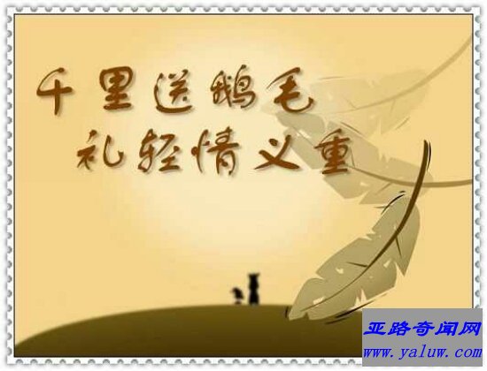 千里送鹅毛,礼轻情意重。这句话的意思就是 虽然送的礼物不值钱,但是这礼物所包含的情意却非常的重。