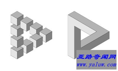 他可以永远地沿着它转圈,但却总是在向上攀登,而且一次又一次地回到他原来的位置!这可能吗?不可能!只是由于我们的眼睛受图画的迷惑而认为这种台阶是存在的.而这些不可能形体正是它在视觉上的类似产物。这个"不可能台阶"是由英国遗传学家列昂尼尔·s·彭罗斯和他的儿子数学家罗杰尔·彭罗斯发明的,后者于1958年把它公布于众,人们常称这台阶为"彭罗斯台阶"。荷兰画家莫里茨·埃舍尔对此深感兴趣,他在他的石版画"攀高和下行"中充分地利用了"彭罗斯台阶。