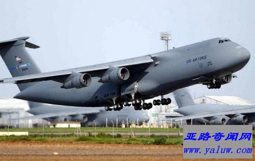 C-5“银河”运输机是美国洛克希德公司生产的大型战略军用运输机,也是美国空军现役最大的战略运输机。C-5机身长75.54米,高18.85米,翼展67.88米,最大起飞重量379吨,最大载重130吨。可以运载2辆M1型坦克,16辆3吨卡车;6架AH-64武装直升机,10枚“潘兴”中程地对地导弹及其发射车辆,36个标准集装货板。