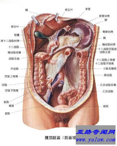 内脏是指在体腔内,借管道直接或间接与外界相通的器官的总称。主要包括人体胸腔、腹腔和盆腔器官的分布:鼻、咽、喉、肝脏、胆囊、胃、肾、小肠、直肠、十二指肠、胰、输尿管、卵巢、膀胱、子宫等。