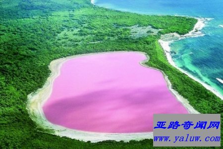 澳大利亚西部洛切切群岛的希勒湖希勒湖是一个有着神秘明亮、粉红色的湖,希勒湖呈现美丽的粉红色,主要是因为湖中藻类产生丰富的β-胡萝卜素,使湖水的盐性大,而且略带著明亮的粉红色。希勒湖也很浅,只有约1米深。