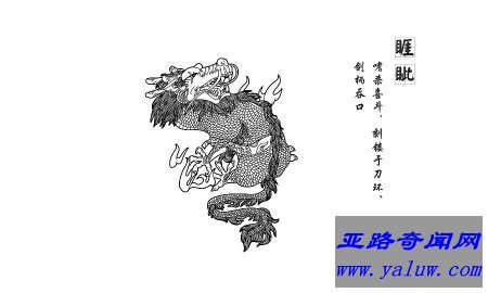 取来一看上面果然记有“九子”之名,但却未记出自何书,无从查考。皇帝的垂询不能拖延太久,李东阳无奈,只得凑合“据以复命”回答说:龙生九子不成龙,各有所好。囚牛,龙种,平生好音乐,今胡琴头上刻兽是其遗像。睚眦,平生好杀,今刀柄上龙吞口是其遗像。嘲风,平生好险,今殿角走兽是其遗像。蒲牢,平生好鸣,今钟上兽纽是其遗像。