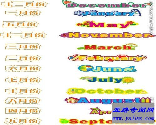 January [ˈdʒænjuəri] n. 一月 (詹牛瑞)February [ˈfebruəri] n. 二月 (法伯瑞)March [mɑ:tʃ] n. 三月 (骂吃)April [ˈeiprəl] n. 四月 (A普柔)May [mei] n. 五月 (妹)June [dʒu:n] n. 六月 (谆) July [dʒu:ˈlai] n. 七月 (朱睐) August [ˈɔ:ɡəst] n. 八月 (欧格斯特)September [səpˈtembə] n. 九月 (色泼滩伯)[ɔkˈtəubə] n. 十月 (欧克投伯)November [nəuˈvembə] n. 十一月 (檽弯伯)December [diˈsembə] n. 12月 (滴三伯)有趣吧?但是用汉字不是好习惯,一定要学音标啊。