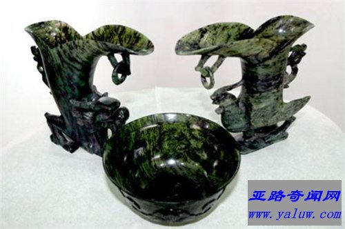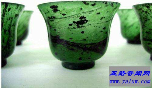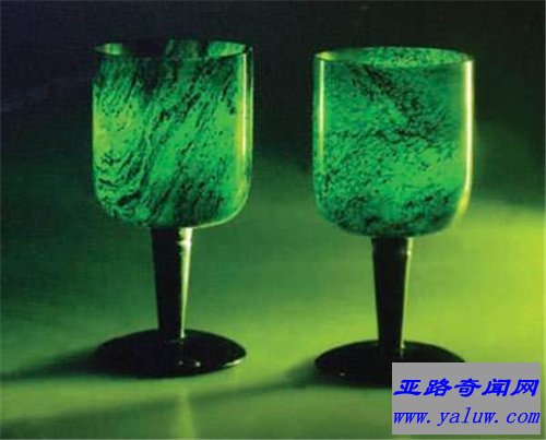 制作夜光杯的这种玉石,产自甘肃祁边山麓,因此叫“祁连玉”,又叫“酒泉玉”,质地细腻,纹理非常好看,从绿色到墨绿色。制作酒杯,需要巧磨细琢,将杯壁做得薄如蛋壳,滑润透明,迎着光线看,就会发现它光泽照人,深浅相间的绿色中交织着半透明的花纹。如果盛满美酒,在月光下波光粼粼,与酒色相映成辉,给人以一种神秘感。