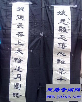 凄风苦雨百年愁。前世典范,后人楷模 名留后世,德及乡梓一生行好事,千古留芳名高风传乡里,亮节昭后人悲声难挽流云住,哭音相随野鹤飞鹤驾已随云影杳,鹃声犹带月光寒朗月清风怀旧宇,残山剩水读遗诗等闲暂别犹惊梦,此后何缘在 晤言天上陨颗明星,人间少名俊杰瑶池来位贵客,佛国添座金刚.