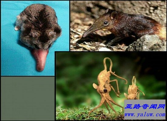 鼻行类动物是胎生的哺乳动物中极为特殊的一目,共有14科189种,栖息在太平洋的哈伊艾爱岛。它们的最大特征是拥有功能奇特的鼻子,用于支撑和移动身体及进行其他一些活动,包括爬行、跳跃和捕捉食物等。这类动物的鼻子数目不等,形态也千奇百怪,有的像柱子,有的像树枝,有的像喇叭,有的像蜗牛。