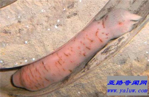 它是一种长圆筒形的软体动物,软乎乎地蠕动,浑身无毛刺,浅黄色。海肠不光长得像裸体海参,其营养价值比起海参也不逊色。个体粗大,长约100一300mm,宽约25-27mm,长200mm-250mm,体表满布大小不等的粒状突起,吻圆锥形;腹刚毛1对,粗大;肛门周围有一圈9-13条褐色尾肛毛。