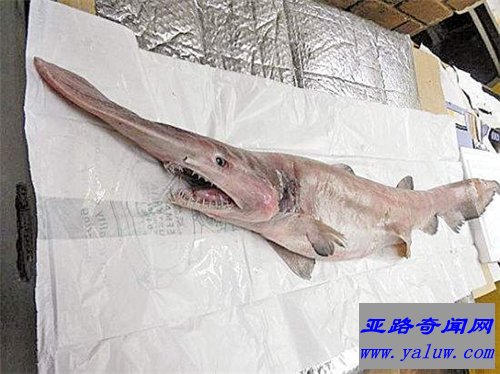 SF Gate报告说10年前出现的一只剑吻鲨使科学家们非常兴奋以致于很快出炉了一篇科学论文。最近的这次平常捕捞中,渔民把网布到水下2000英尺(610米)深处,使他们吃惊的是他们发现网上来的虾堆中竟然有个粉红色的大家伙。这个有着史前长相有时被称为“活魔鬼”的家伙伤得很重摔在甲板上,尖利的牙齿使渔民们都不敢靠前丈量。