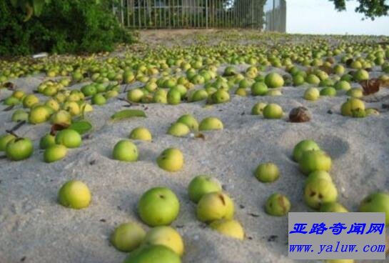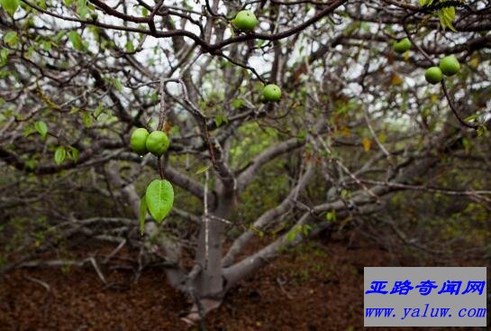 世界上最危险的树的果实有着明显的毒性,所以当西班牙人踏上这块土地时,称呼毒番石榴的果实为“死亡小苹果”,它的果实大约有2.5~5公分宽,但只要你咬一口这种甜美的果实,就可能会痛苦好几个小时,甚至可能死亡。不过可别以为毒番石榴只有果实有毒,事实上这种植物整株都有毒,碰到它的任何一个部分都可能致命,叶子、树枝。