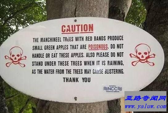你所不知道的世界上最危险的树,毒番石榴平常看起来和普通的树并无二致,但是当你咬下它的果实,被毒伤的剧痛就有可能致命。世界上最危险的树上甚至要贴上标牌,就连站在树下躲雨,树的汁液碰到人也会像被火烧了般灼伤。