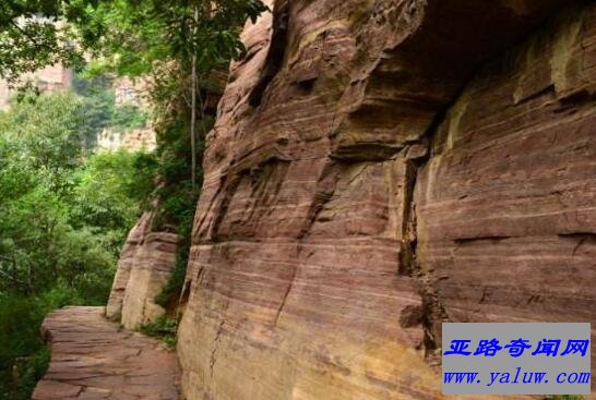 太行山音洞壁是世界上最大的天然回音壁,它位于河北省太行山区赞皇县境内的一处箱状峡谷中,坐西朝东为准半圆桶形。直径90米,弧长延伸达300多米,陡壁高100米,呈半封闭型。历史这把时光鬼斧造就了嶂石岩的奇石奇壁,一块高约六米,长达二十米的紫红色砂岩,沿岩层面裂开,就如同用斧头劈开一样。
