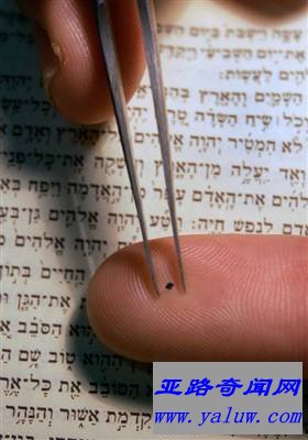 以色列科学家利用纳米技术在0.01平方英寸的硅表面蚀刻上了30万字的圣经,而他们用的时间也仅仅是1个小时左右。这应该称的上是世界上最小的圣经了。