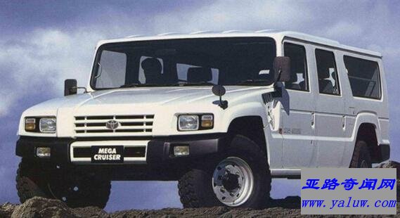日本丰田最大的越野车实际上是Mega Cruiser,虽然表面上是为日本自卫队提供的高机动性车辆,并协助救 灾之用而开发的车型。但是当丰田见到HUMMER在乘用车市场大受欢迎时,不甘寂寞的丰田汽车于 1996年推出了一款与H1非常神似的大型SUV-Mega Cruiser。