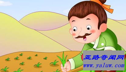 故事讲的是宋国有一个农夫,他担心自己田里的禾苗长不高,就天天到田边去看。可是,一天、两天、三天,禾苗好象一点儿也没有往上长,他十分焦急。一天,他终于想出了办法,急忙奔到田里,把禾苗一棵棵地拔,从早上一直忙到太阳落山,弄得精疲力尽。