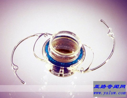 一枚微型望远镜在被植入人类眼球前的近距离照片,我们可以清晰地看到这枚望远镜的内部结构,通过其透明的保护外壳,我们可以看见内部微型的玻璃镜头。