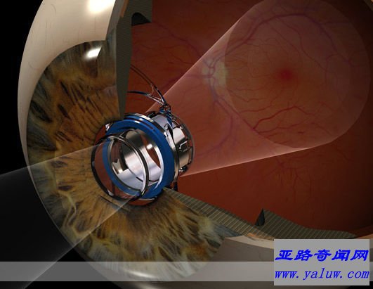 艺术家所描绘的微型望远镜的工作原理图。由于某些老年人的视网膜的感光区域由于病变而失去功能,该区域由图中的灰黄色斑点表示,微型望远镜可以安装在虹膜中间的瞳孔位置,当外界光线经过微型望远镜进入眼球时,微型望远镜会改变光线的投影聚焦位置,使图像投射在没有发生病变的视网膜区域,于是病人的视觉就可以恢复和提高。