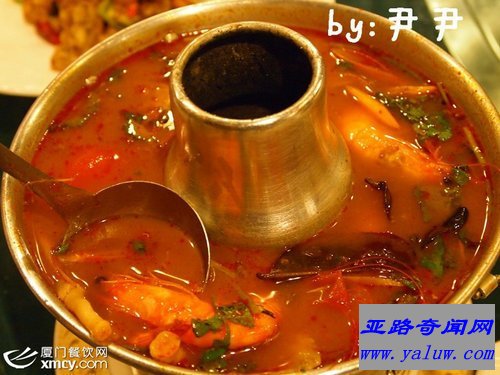 其做法有点像做汤与做凉拌菜的综合。泰国地处热带,因此孕育了许多有名的YAM,比较着名的有一种叫做“SOMTAM”的木瓜沙拉,这种沙拉以木瓜丝、虾米、柠檬汁为主,再伴以鱼酱、大蒜和杂的碎辣椒,口感辛辣。辣级:3级。