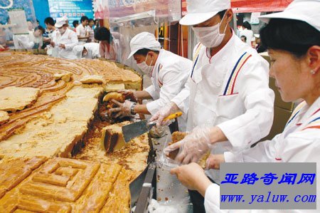 每年,中国有不少地方都制作出了不少超大的月饼,但世界上最大的月饼,当属“中华圆月”,其直径8.15米,厚20厘米,表面积52.14平方米,体积10.43立方米,重约12.98吨。这个记录截止到目前依然没有其他月饼能够超越的,只能说中国有太多无聊到蛋疼的人。