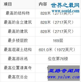 哈利法塔高828米,楼层总数162层,造价15亿美元,大厦本身的修建耗资至少10亿美元,还不包括其内部大型购物中心、湖泊和稍矮的塔楼群的修筑费用。哈利法塔总共使用33万立方米混凝土、6.2万吨强化钢筋,14.2万平方米玻璃。为了修建哈利法塔,共调用了大约4000名工人和100台起重机,把混凝土垂直泵上逾606米的地方,打破上海环球金融中心大厦建造时的492米纪录。大厦内设有56部升降机,速度最高达17.4米/秒,速度仅次于上海第一高楼的18米/秒,另外还有双层的观光升降机,每次最多可载42人。