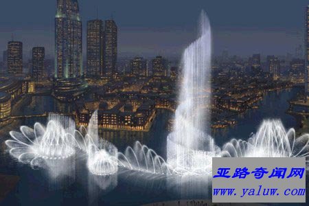 迪拜注定会成为世界注目的焦点,它正在兴建未来世界最高的大楼“迪拜塔”,而现在又将在这座世界第一高楼附近打造一个世界上最大的音乐喷泉。这个喷泉设计高为150米,长275米,相当于两个足球场长,而且可以变幻1000种造型,预算高达2.18亿美元,将于2009年投入使用。