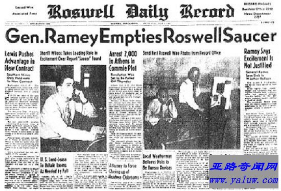 7月8日,在《罗斯维尔事件报纪事报》的头条上,引用了罗斯威尔陆军空军基地的一位公关官员,该基地的少校杰西·马瑟尔收到了一份飞碟酱。来自一个牧场工人,把它送到空军第八部队的总部。这个消息立刻引起了各行各业的好奇心,然而6个小时后,空军第八部队总司令罗杰·雷梅宣布推翻了马少校的声明。