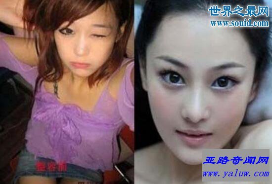 看左右两张图这是同一个人吗?是的,请相信你的眼睛!整容前张馨予小眯眼大鼻子,还有这恶心的眼线是什么鬼,不要吓人好吗?做了割双眼皮隆鼻和缩鼻翼手术后,立马从村姑变女神!